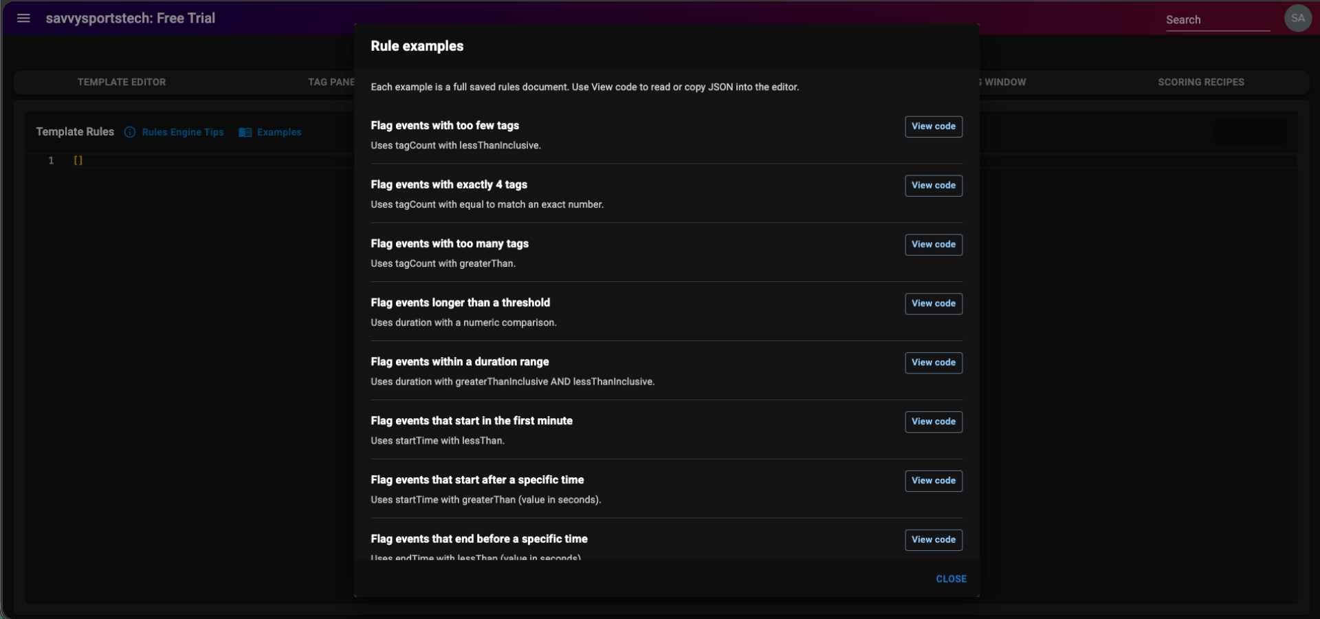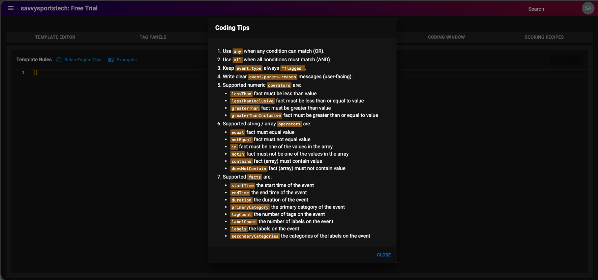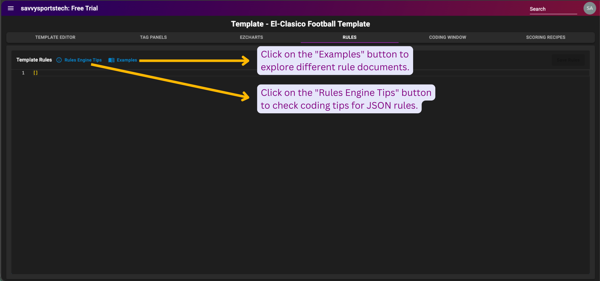 Click on the "Rules Engine Tips" button to check JSON rules coding tips for use in the editor.