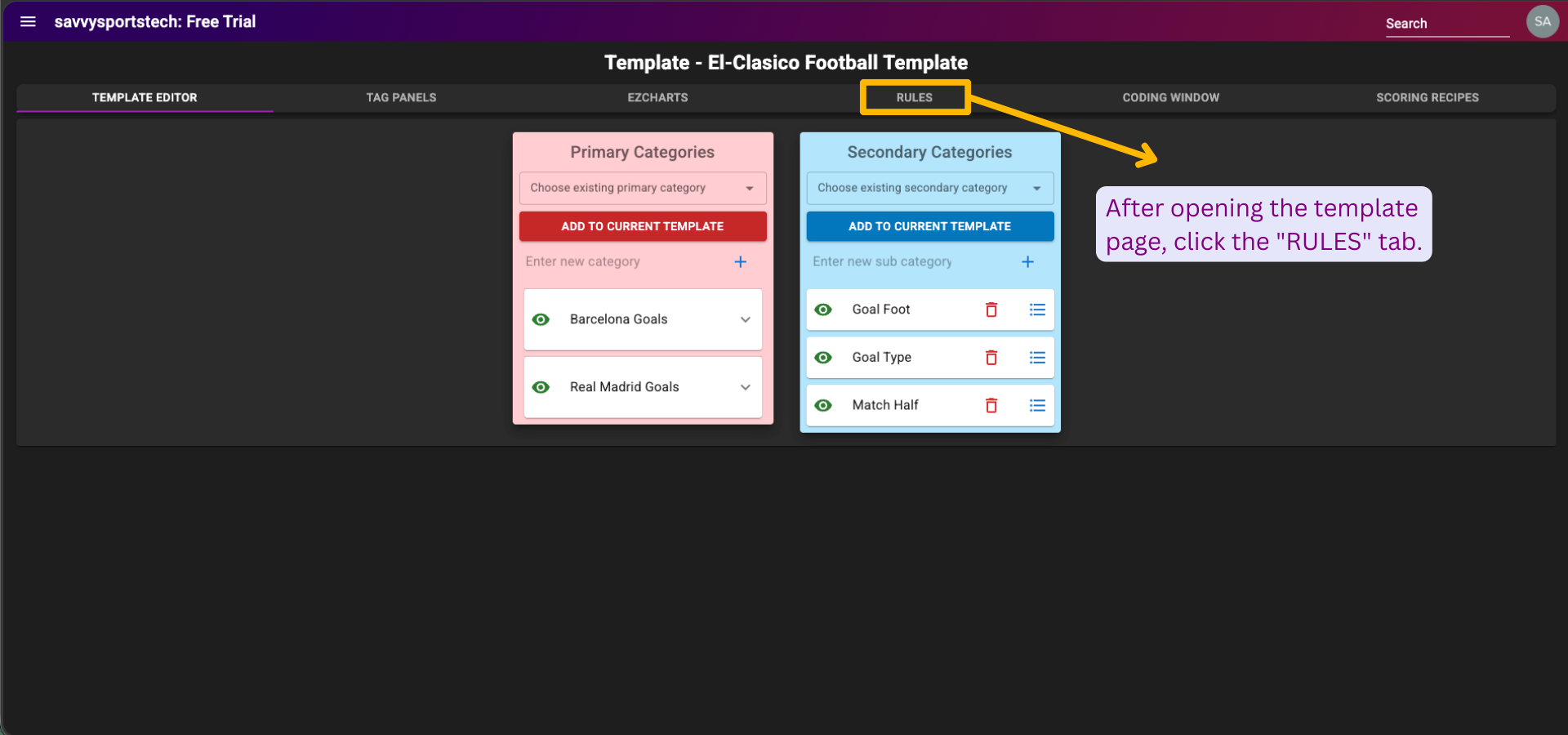 Once clicked, if no rules have been set up before, the Rules page will appear empty in the "Template Rules" editor, as shown below.