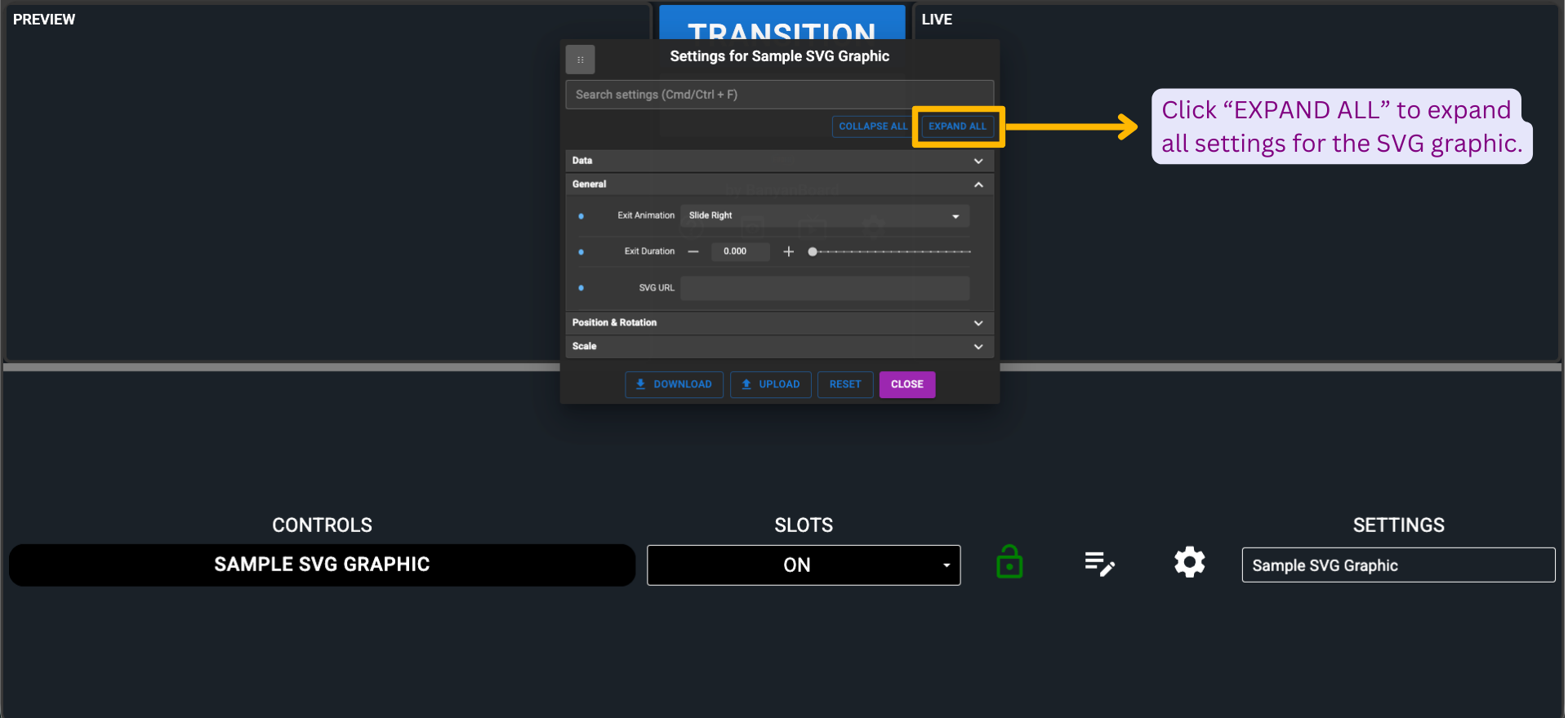 Once clicked, a dialog box titled "Settings for SVG Graphic" will open. Click "EXPAND ALL" to expand all settings for the SVG graphic, or click "COLLAPSE ALL" to collapse them.
