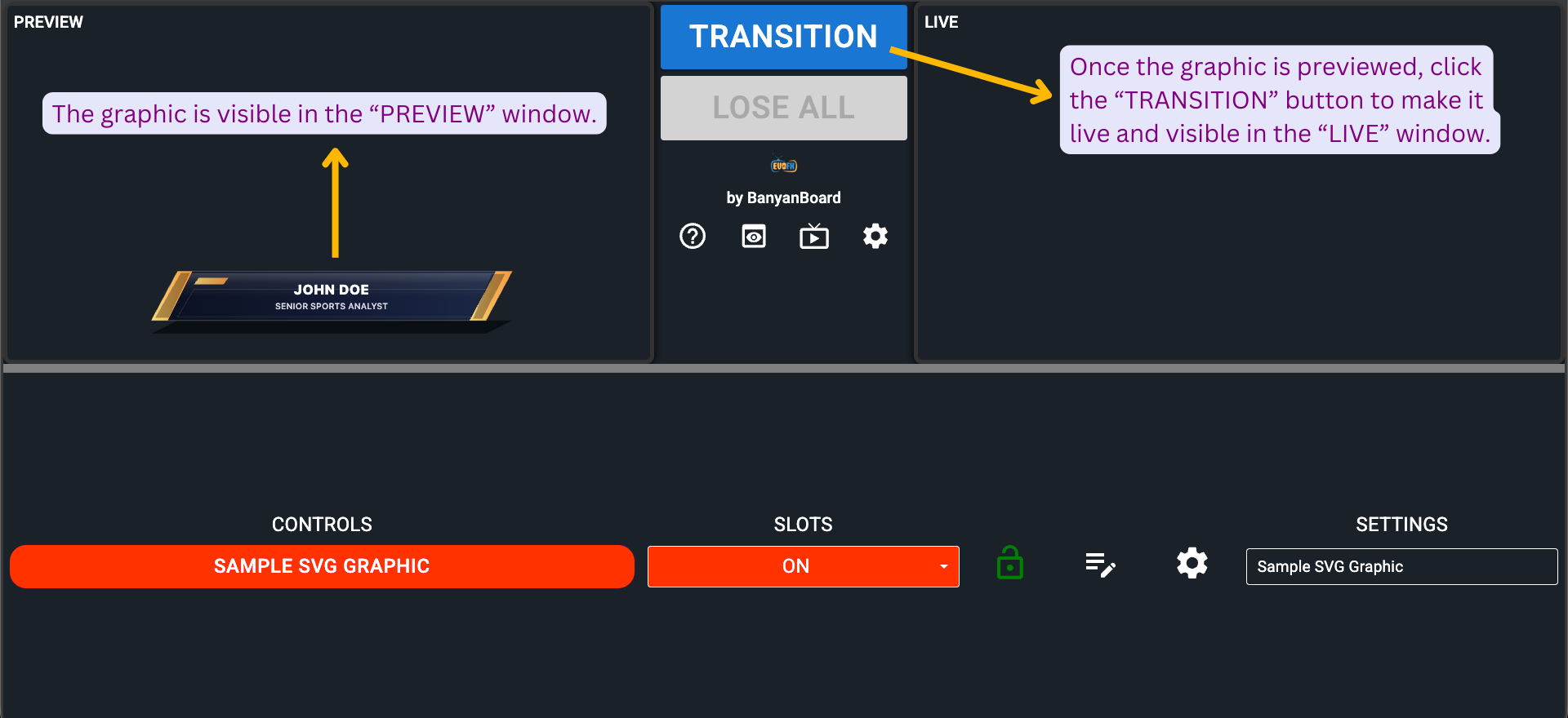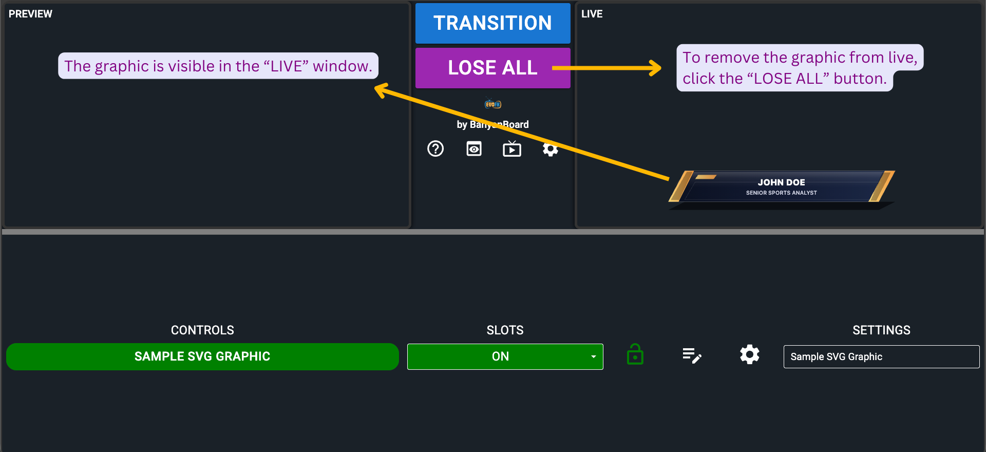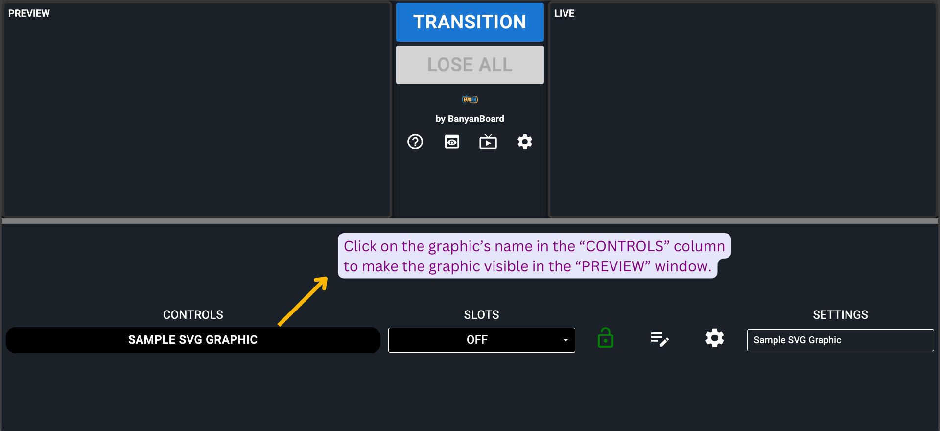 Upon clicking, the graphic name's background in the "CONTROLS" column will turn green, and the graphic will be visible in the "LIVE" window. To remove the graphic from live, click the "LOSE ALL" button.