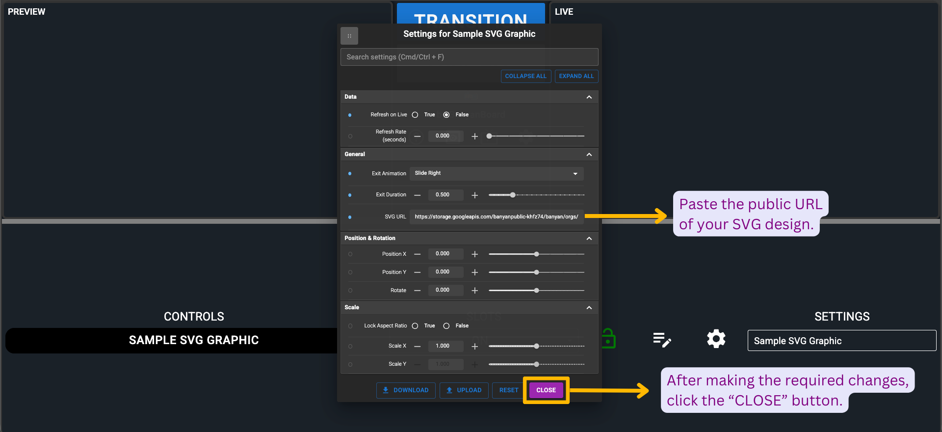 Once clicked, the graphic name’s background in the "CONTROLS" column will turn red, the "SLOTS" dropdown will be set to "ON", and the graphic will be visible in the "PREVIEW" window. After previewing the graphic, click the "TRANSITION" button to make it live and visible in the "LIVE" window.