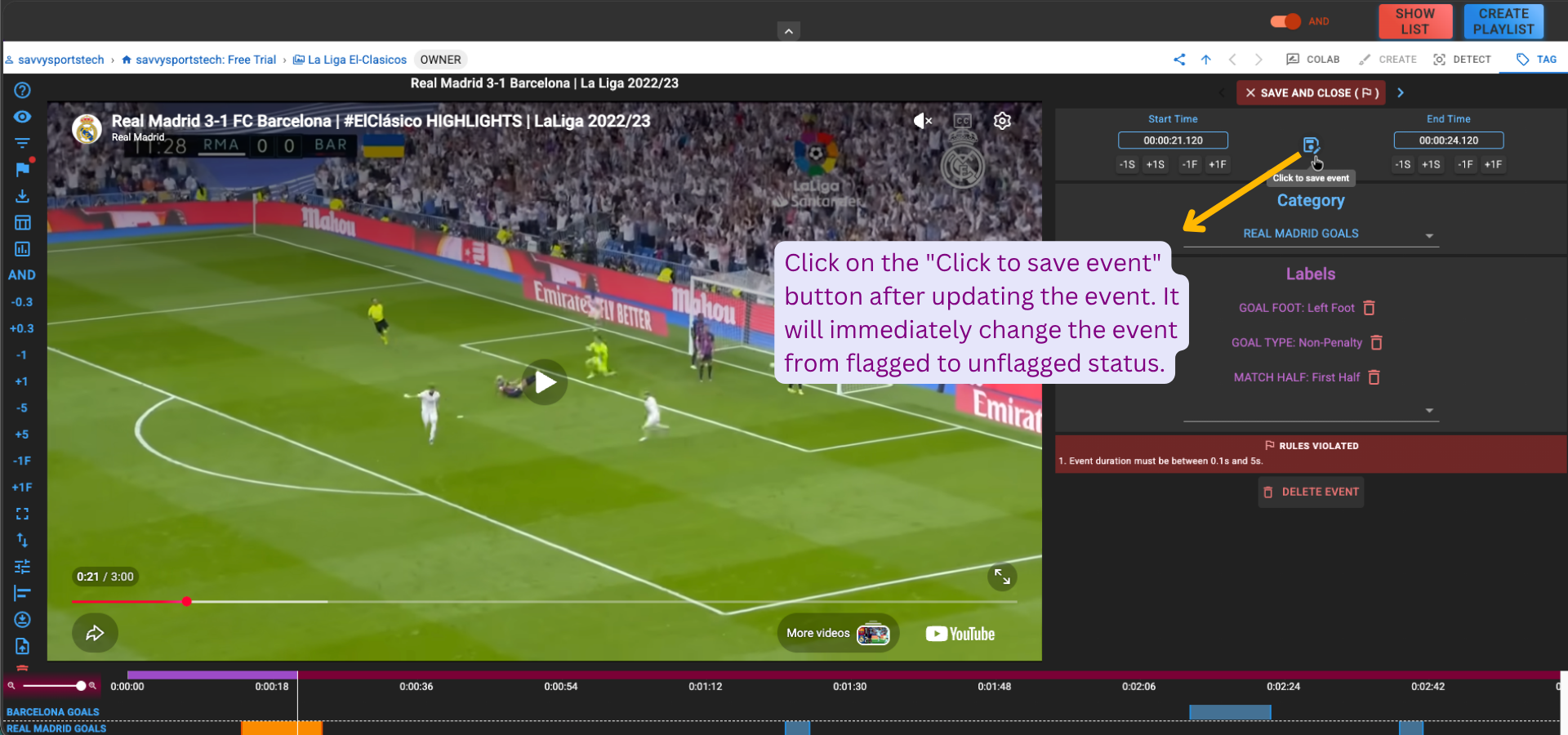 Click on the "Click to save event" button after updating the event. It will immediately change the event from flagged to unflagged status..
