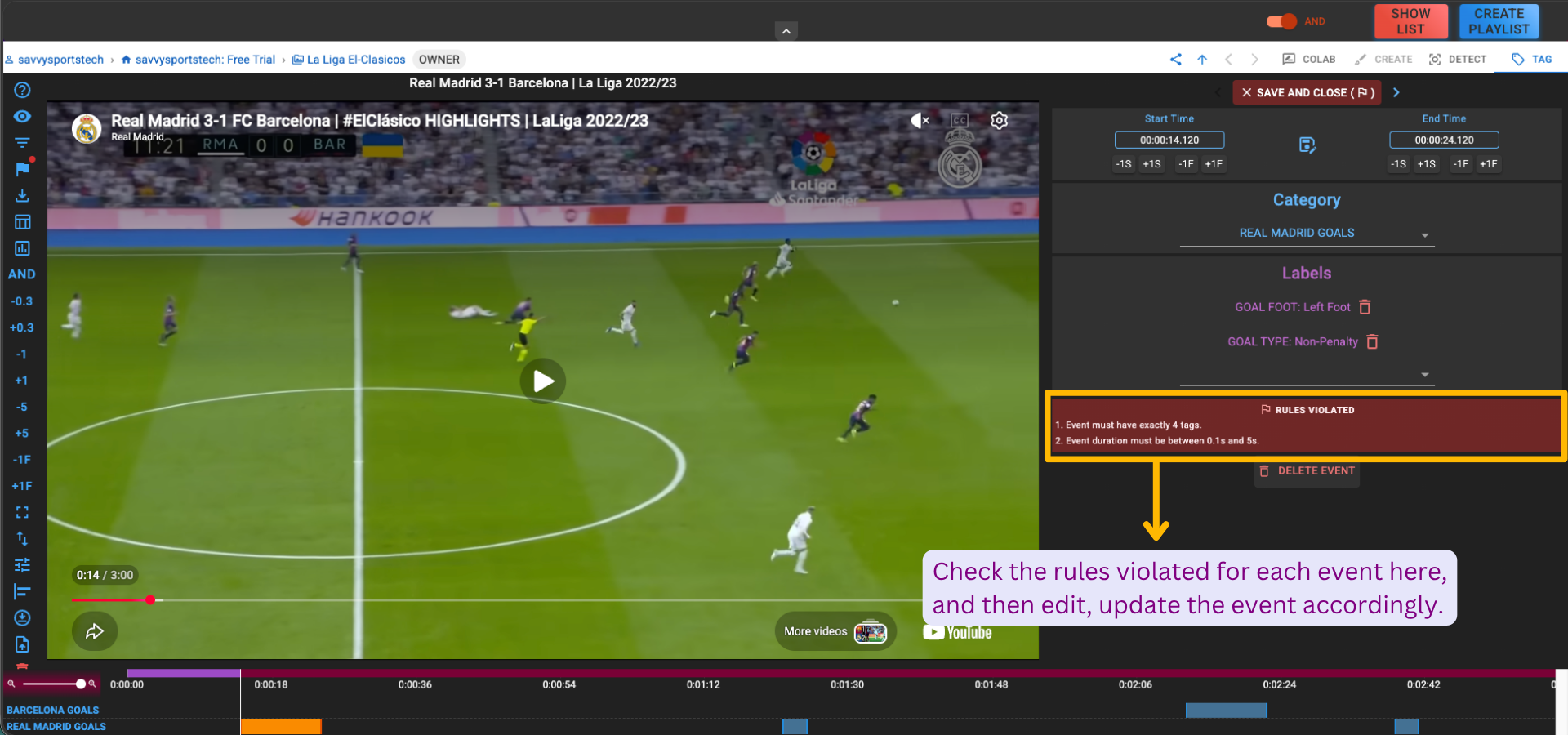 Once clicked, check the rules violated for that event in "RULES VIOLATED" section, and then edit, update the event accordingly.