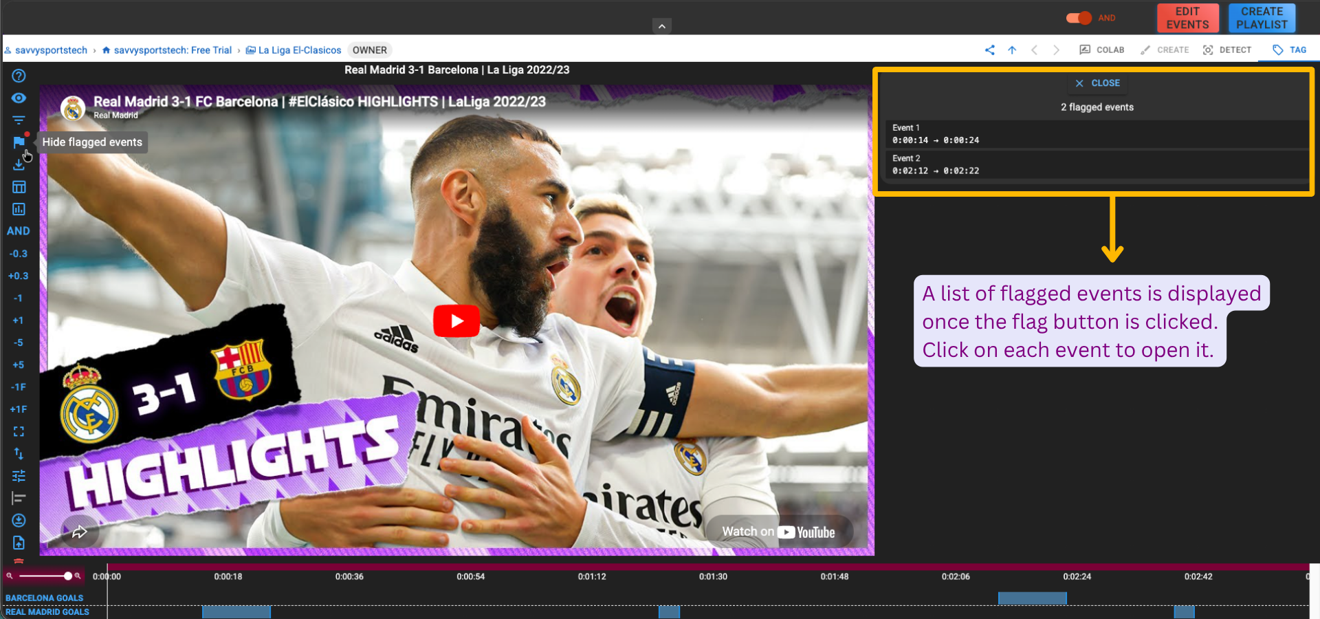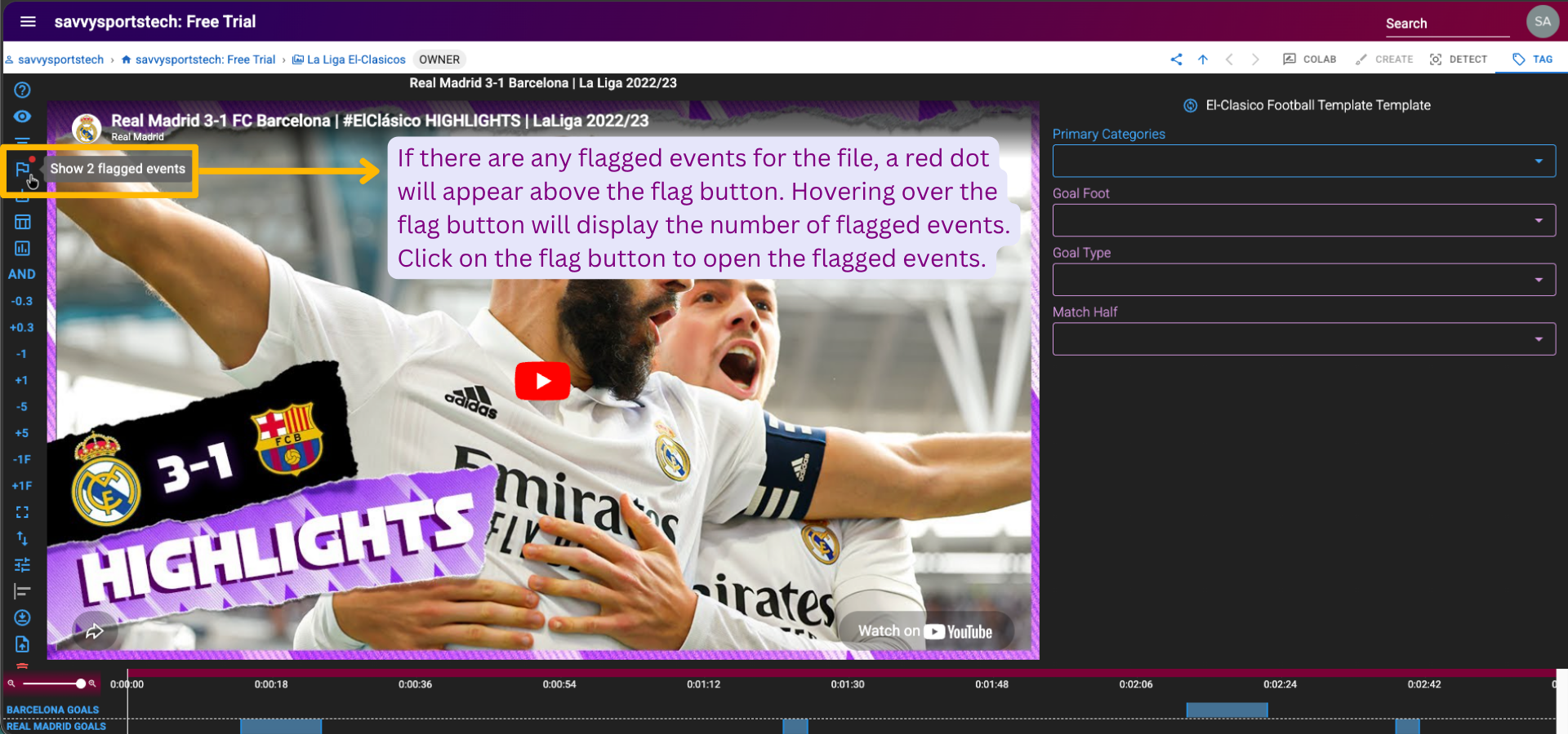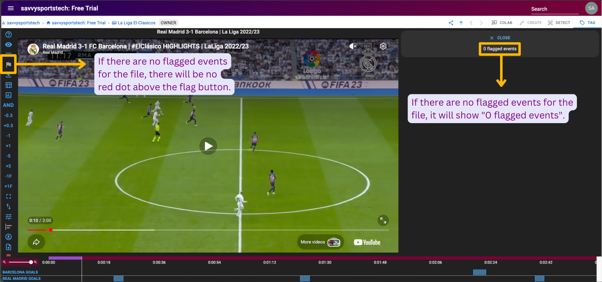 If there are no flagged events for the file, there will be no red dot above the flag button on the left panel, and it will show "0 flagged events" on the right side of the page.