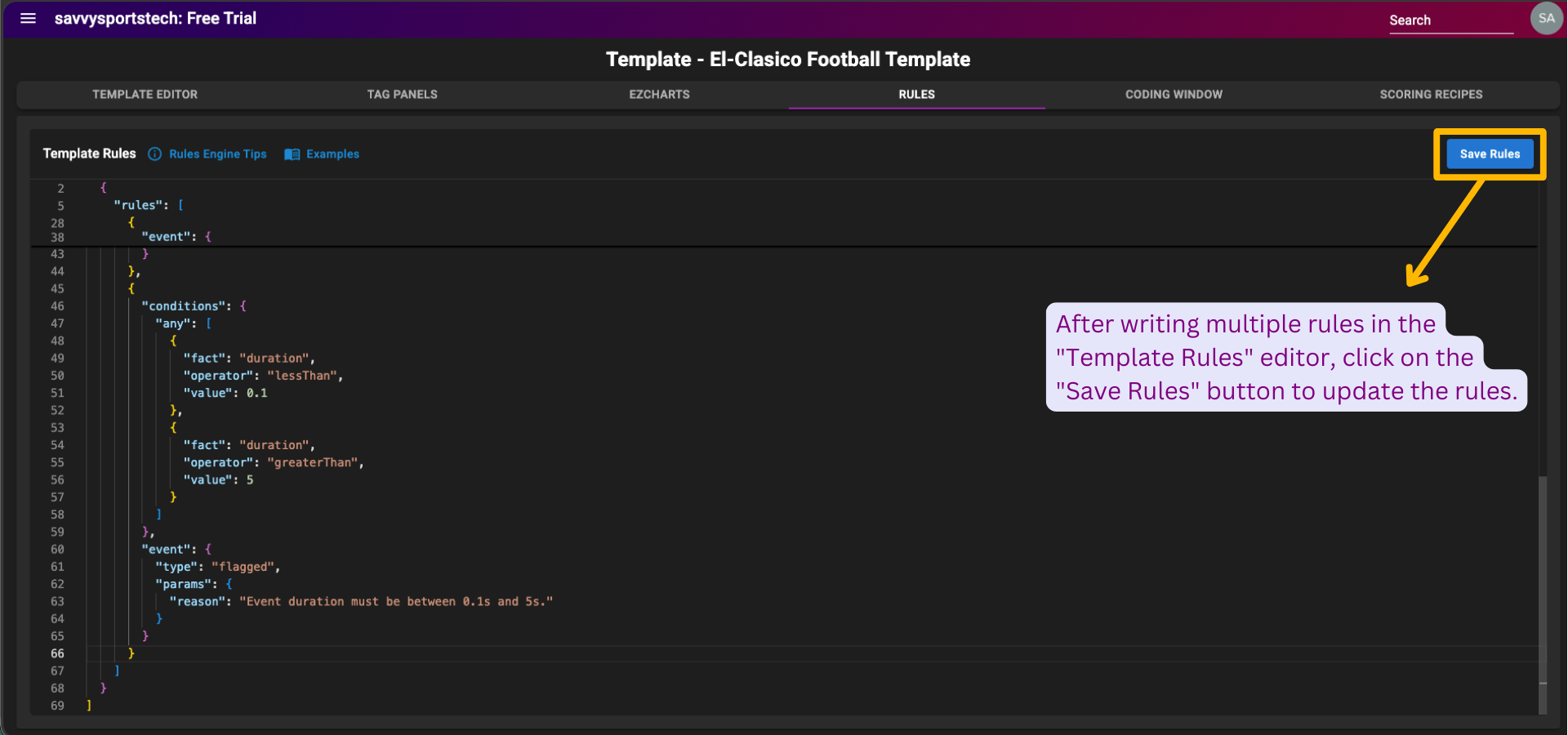 After writing multiple rules in the "Template Rules" editor, then click on the "Save Rules" button at the top right of the page to update the rules.