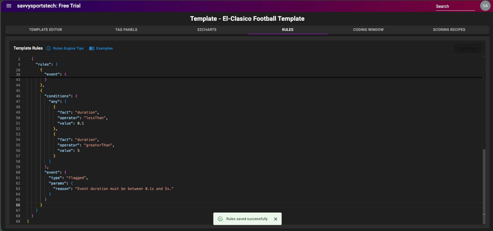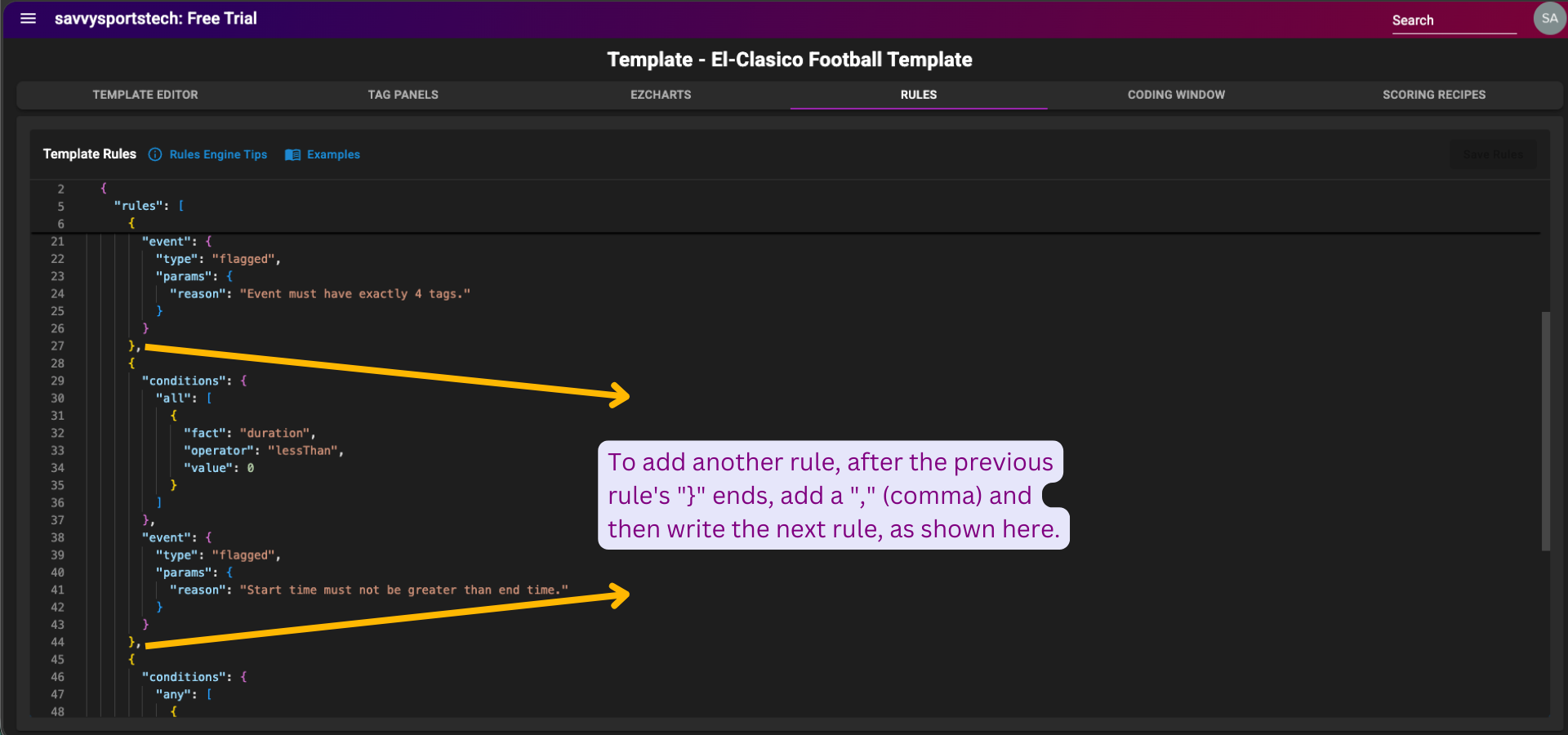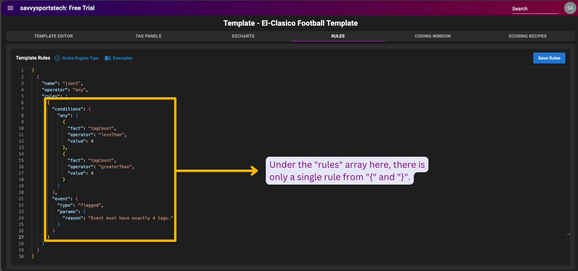 To learn how to access the Rules page and view some rule examples for a template in SPAN sports performance analysis platform, refer to this
